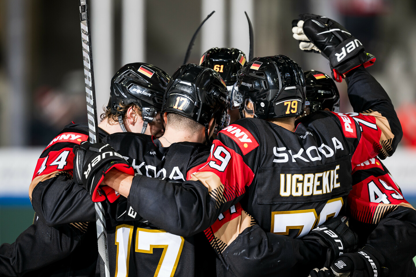 Die Spieler von Team Deutschland feiern das Tor zum 2:0 während des Spiels zwischen Deutschland und Dänemark am 09.11.2023 in Landshut, Deutschland.