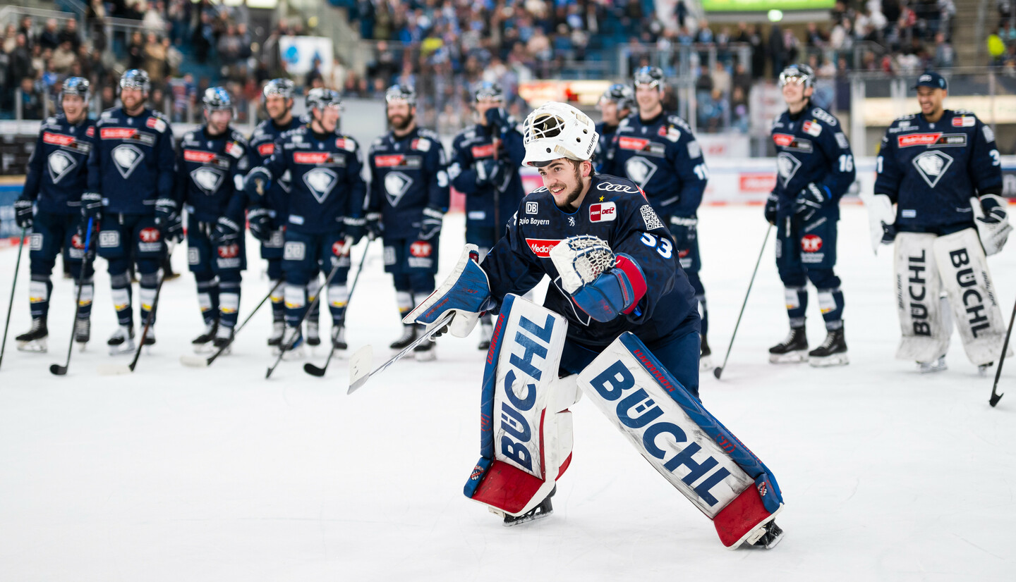 ERC-Goalie Erik-Eder: „Als ich auf das Eis kam, war ich schon ein wenig nervös, aber die Freude über meinen ersten Einsatz in der DEL hat deutlich überwogen. Riesiges Kompliment an die Mannschaft, die vor mir viel weggenommen und für mich gekämpft hat.“