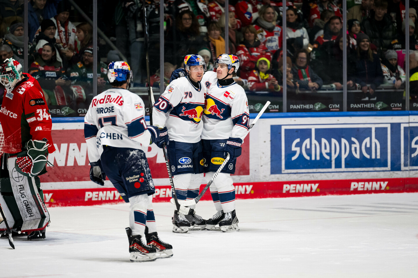 Der EHC Red Bull München gewann am 21. Spieltag der PENNY DEL-Saison 2025/26 das Derby bei den Augsburger Panthern deutlich mit 8:3 (3:1|2:0|3:2) und machte damit das Sechs-Punkte-Wochenende perfekt. Vor 6.179 Zuschauern erzielten Yasin Ehliz, Patrick Hager, Jeremy McKenna (2), Ville Pokka, Maximilian Daubner, Tobias Rieder und Philipp Krening die Tore für die Mannschaft von Trainer Oliver David beim fünften Sieg in Serie gegen die Fuggerstädter.