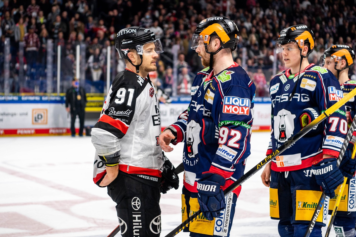 Moritz Müller von den Kölner Haien und Marcel Noebels von den Eisbären Berlin nach dem Spiel zwischen den Eisbären Berlin gegen die Kölner Haie am 14.04.2022 in Berlin