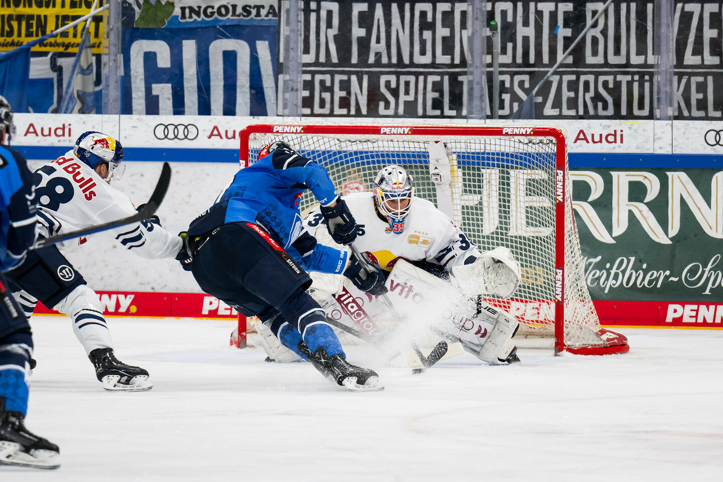 Ingolstadt durfte schon früh mit einer 5-gegen-3-Überzahl anlaufen (3.), die Red Bulls verteidigten aber clever und hatten – wieder komplett – den ersten Hochkaräter des Derbys: Andreas Eder setzte den Puck von der Strafbank kommend an die Latte (5.). Danach ein offener Schlagabtausch. Beide Teams überbrückten die neutrale Zone im Eiltempo und suchten den schnellen Abschluss. Die Folge waren Chancen – darunter die Riesenmöglichkeit von Trevor Parkes nach einem Pfostenabpraller (20.). Ein Tor fiel im ersten Drittel aber nicht.