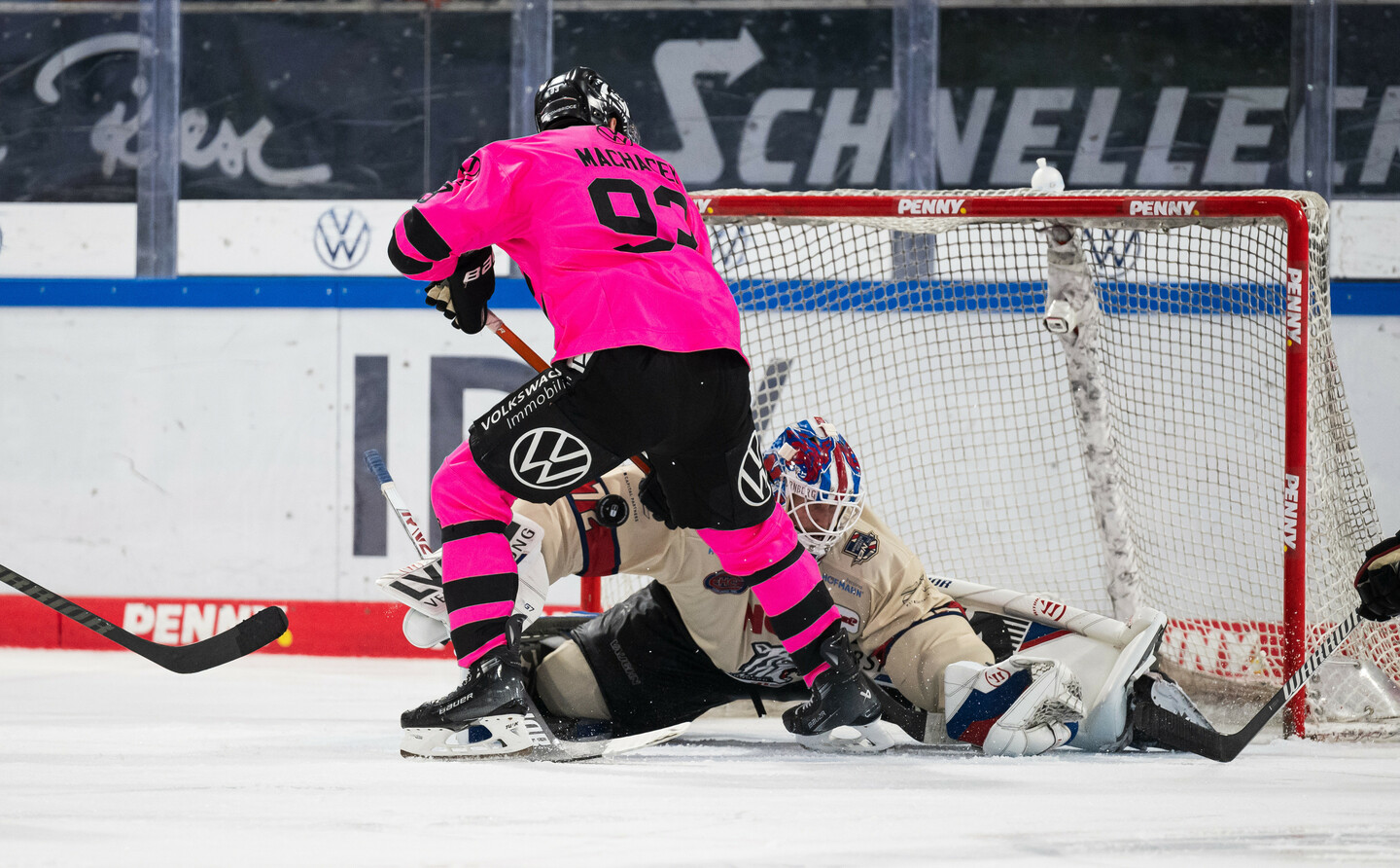 Auf der Gegenseite musste Dustin Strahlmeier zwischen den Pfosten der Autostädter ein ums andere Mal den Rückstand verhindern. Das tat er gegen Evan Barratt spektakulär (16.), auch gegen Charlie Gerard war er zur Stelle (18.). Zuvor hatte der Pfosten bei einem „Abfälscher“ von Ryan Stoa den Einschlag verhindert (12.).