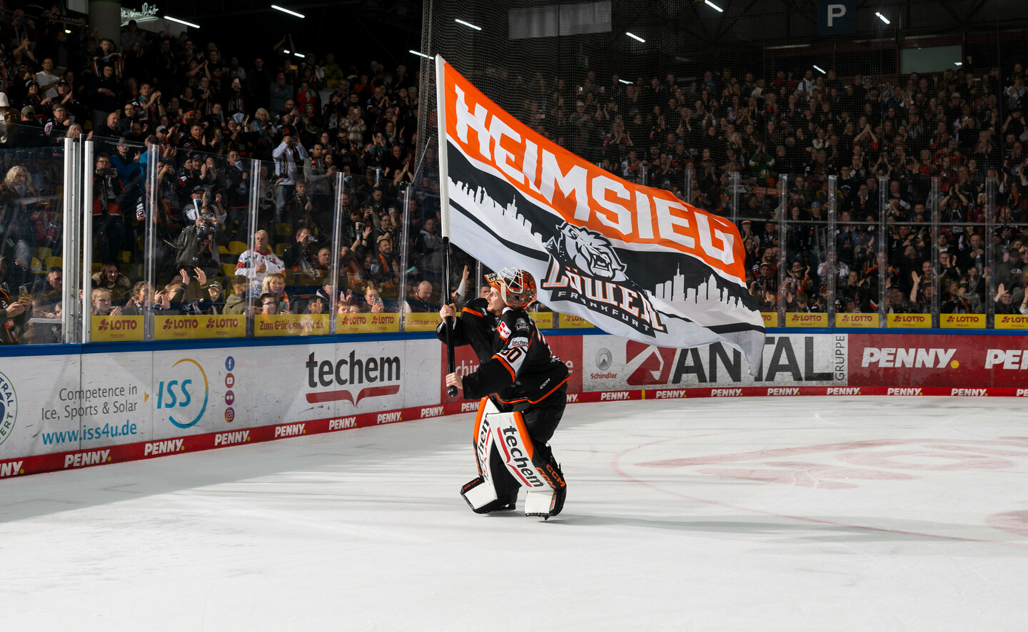 Nach dem Schlusspfiff hat Mirko Pantkowski dann noch einmal viel zu tun. Die #30 wird erst zum MVP gewählt, fährt anschließend mit der Heimsiegfahne durch die Nix-Eissporthalle, geht dann zum TV-Interview, bevor er endlich vor den Fans tanzen kann.