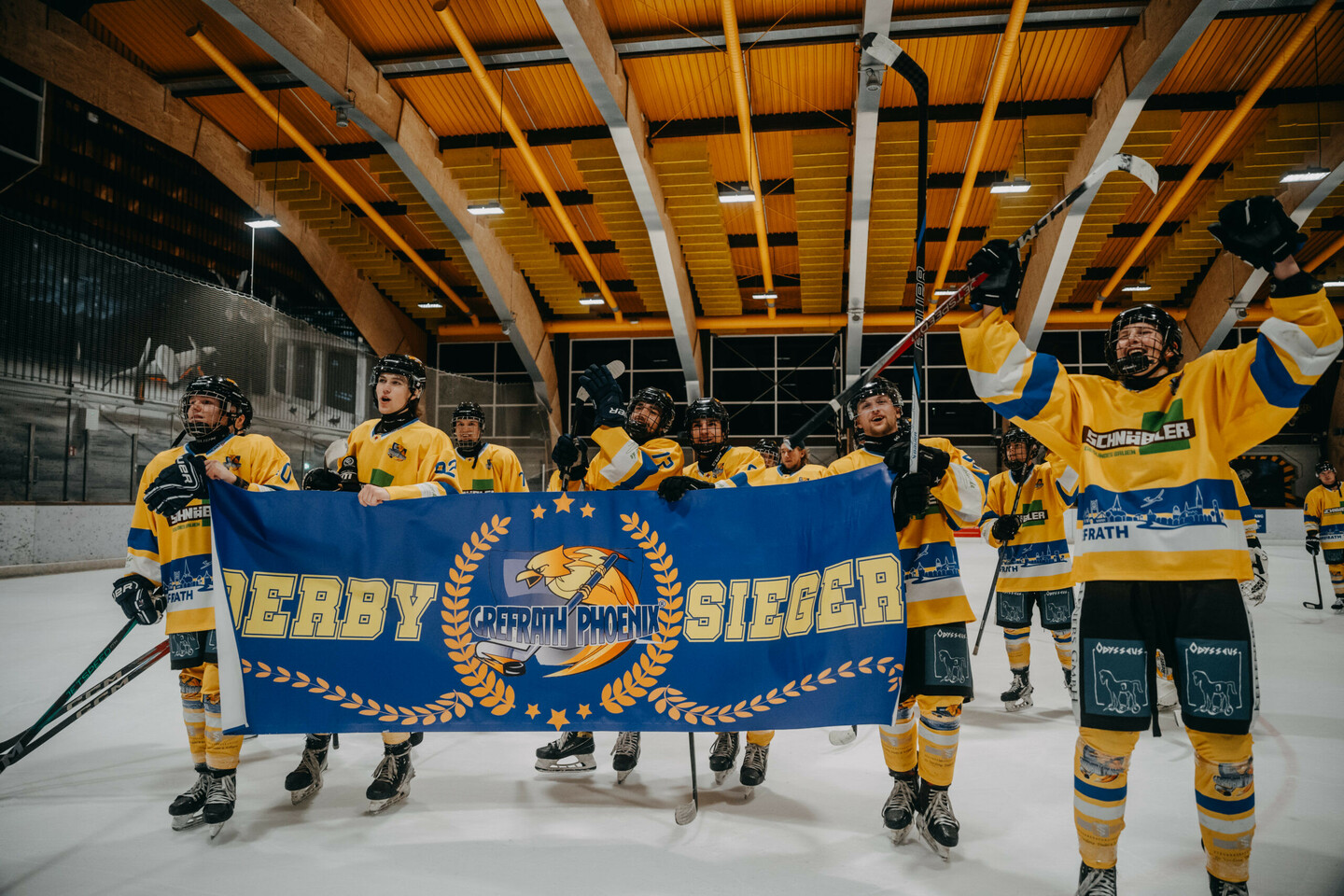 Nach dem Spiel herrschte grenzenloser Jubel bei Mannschaft und Fans, die gemeinsam die gelungene Revanche feiern konnten. Christian Tebbe fasste das aus Grefrather Sicht „perfekte Wochenende“ wie folgt zusammen: „Am Freitag sind wir etwas holprig gestartet, haben am Ende aber mehr als verdient den Sieg gegen Troisdorf erkämpft. Das war der perfekte Grundstein für das Derby gegen Moers. Die Anspannung im Vorfeld war den ganzen Tag im gesamten Verein spürbar. Wir waren alle sehr heiß auf diese Herausforderung, welche die Jungs von der ersten bis zur letzten Sekunde konsequent angenommen haben. Auch unter Druck sind wir defensiv stabil geblieben. Mathis Kaiser hat mit seinem bärenstarken Shutout ein überzeugendes Spiel gemacht und bewiesen, wie wichtig er für den Derbysieg war“. Ein großes Sonderlob hatte Tebbe noch für den zahlreichen und lautstarken Phoenix-Anhang: „Ein riesiges Dankeschön an unsere unglaublichen Fans auf der Tribüne. Ihr habt die Halle zu unserem Heimspiel gemacht und uns 60 Minuten lang nach vorne gepeitscht!“.