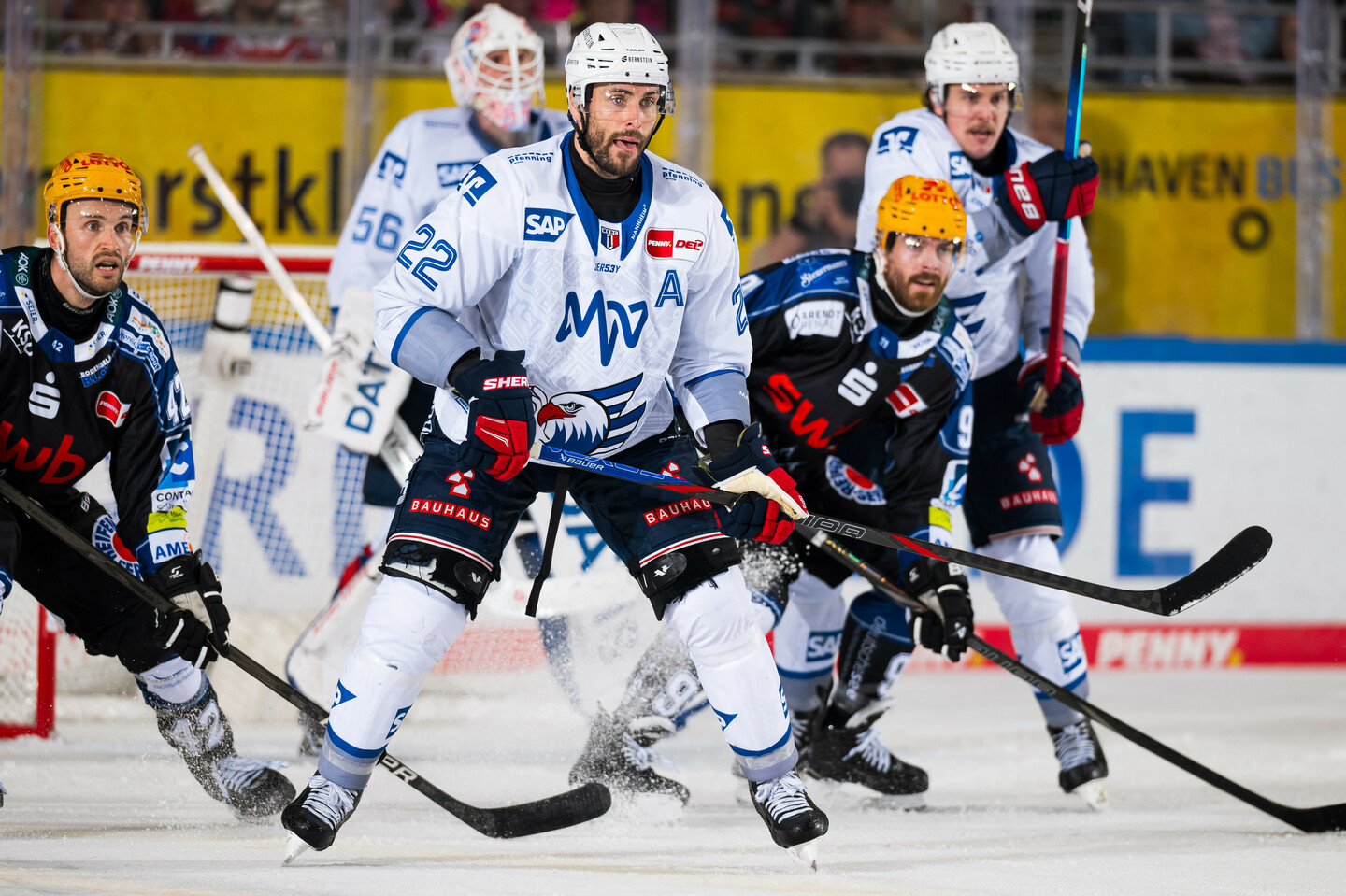 Die hätte Greco kurz nach Wiederbeginn auf 3:1 ausbauen können, scheiterte aber beim einem Zwei-auf-null-Konter an Hungerecker (22.). Versäumtes holte Kris Bennett nach, der vom rechten Bullykreis erfolgreich war (26.) Dieses Mal waren es die Hausherren mit der raschen Reaktion. Ein verunglückter Schuss von Christian Wejse fand den Weg über die Linie (27.). Schütz war auf der Gegenseite allerdings aus der Drehung erfolgreich und brachte die Adler wieder mit zwei Toren in Front (30.). Franzreb war im Anschluss gegen Bennet Roßmy (30.) und Nico Krämmer (35.) zur Stelle, gegen den Nachschuss von Ross Mauermann war er aber chancenlos (36.). Mit einem schnellen Fanghandsave in Unterzahl gegen Jan Urbas hielt der Mannheimer Schlussmann aber die 4:3-Führung nach 40 Minuten fest.